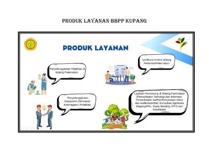 Jasa Layanan BBPP Kupang meliputi Penyelenggaraan Pelatihan Bidang Peternakan/Pertanian; Kerjasama Pelatihan dan Ketenagaan, Sertifikasi Profesi Bidang Pertanian/Peternakan; dan Layanan Pendukung di Bidang Peternakan berupa Pemanfaatan Teknologi Informasi, Pemanfaatan Sarpras/Penyewaan Mess dan Auditorium/Hall, Konsultasi Agribisnis, Magang/PKL, Study Banding, PPID dan Eduwisata.